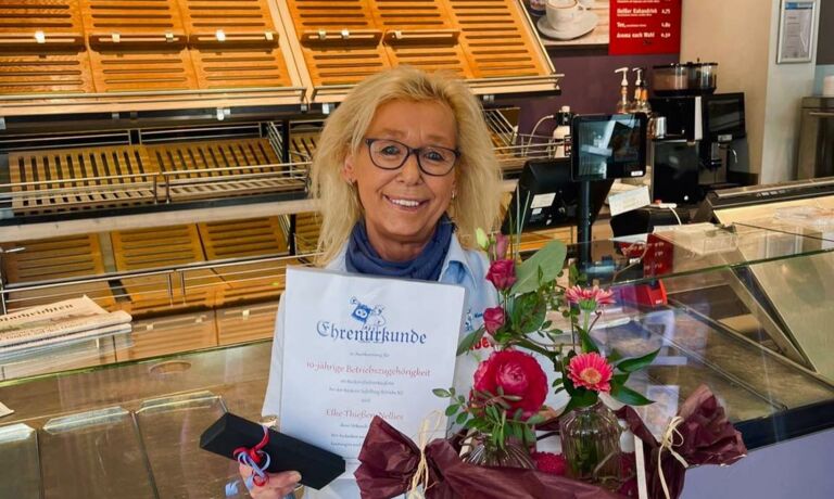 Heute konnten wir unserer engagierten Bäckereifachverkäuferin Anja aus unserer Filiale in Pönitz zu ihrer 10-jährigen Betriebszugehörigkeit gratulieren.